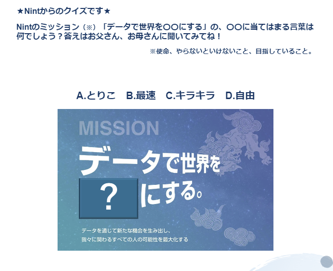 今年は「ミッション」に関するクイズでした。様々な会話が各家庭で繰り広げられたようです。