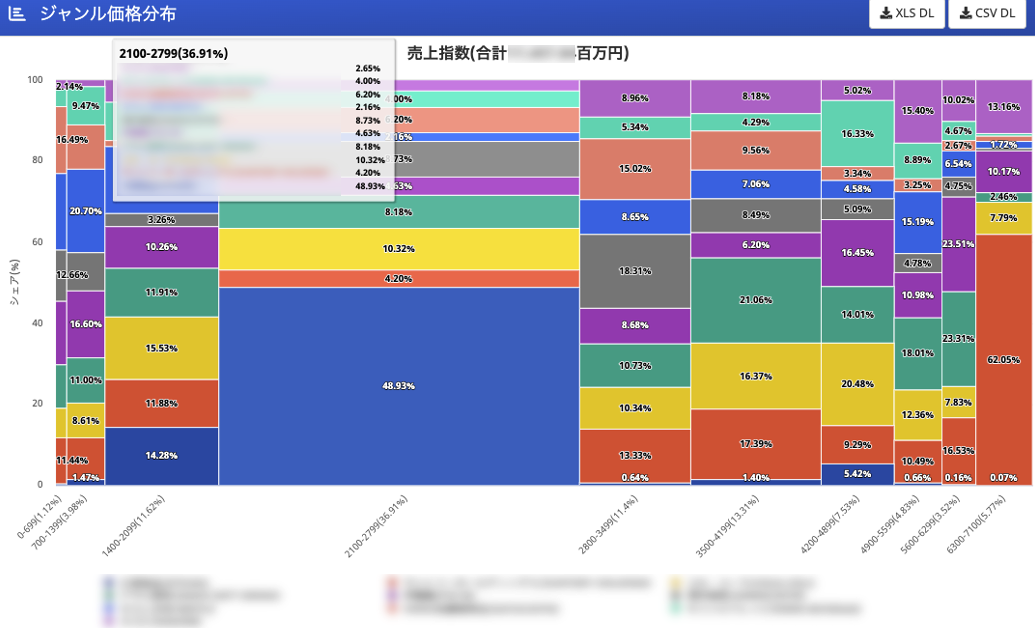 ジャンル内での価格帯別やメーカー別の売上シェア率も確認可能です。