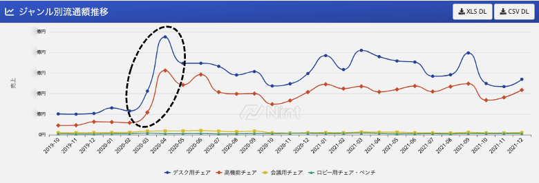 これは、コロナ禍による在宅での勤務の必要性が急拡大した結果、在宅勤務のためにオフィスチェアを購入する消費者が非常に多かったことが理由であると推察できます。