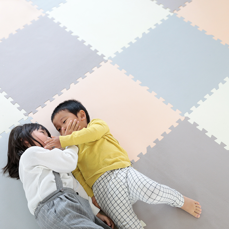 - ほんとだ!温かみのあるカラーリングで、今まであったジョイントマットとは一味違いますね。子供向け商材だと、どうしても鮮やかなカラー展開が多いですから。企画の意図が撮影画像から伝わってきました!