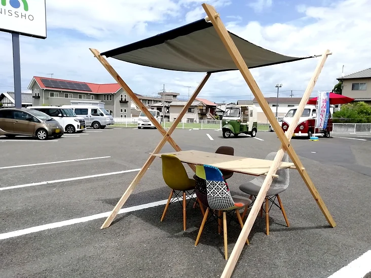 飲食スペースになっているテント、実は既製品ではありません。松山にあるFD-Techにお願いして製作していただきました。FD-Techは愛媛県松山市で建築・リノベーションを手掛ける会社。Instagramを見ていた際に、一般的なテントにはないおしゃれさと利便性のあるテントを販売されていたのに惹かれ、製作をお願いしました。