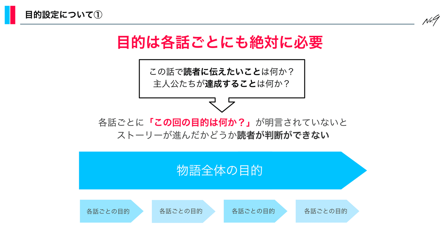 目的は各話ごとに設定しないと、ストーリーの進展は読者に届かない