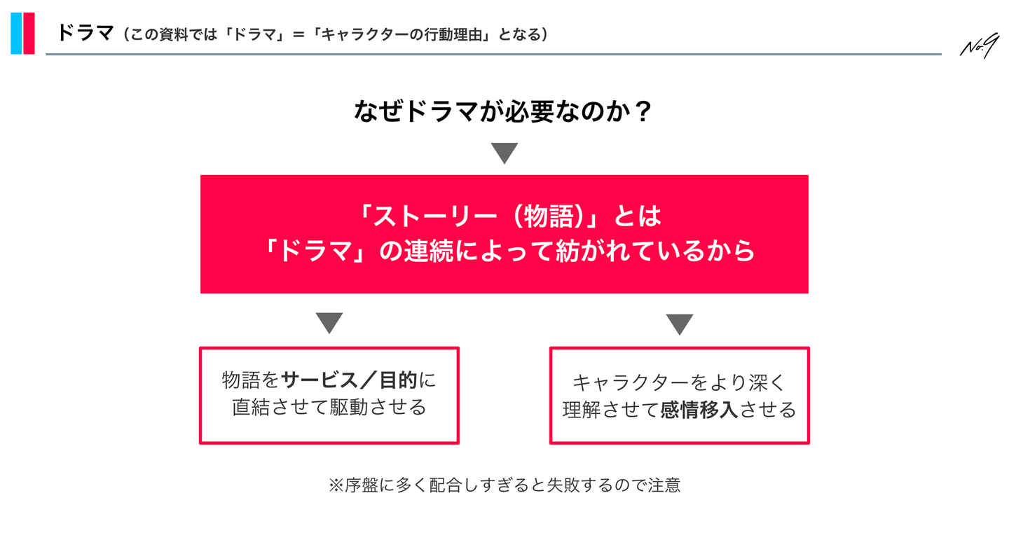 ドラマとは、感情行動の発生から収束までの過程を指します。ドラマがあることで、キャラクターをより読者に理解させ、感情移入させるドラマや展開を生むことができるのです。