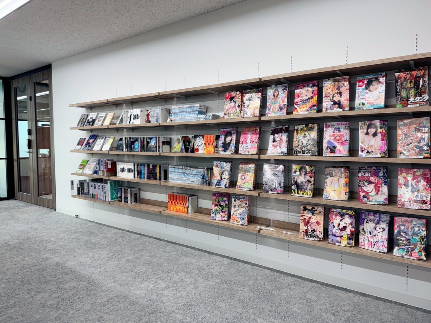 エントランスを抜けて、オフィスエリアへ。すぐ横には本棚スペースができました!ここには役員陣の推薦図書からナンバーナイン必読漫画リスト、そして、主要漫画誌が一挙に揃います。
