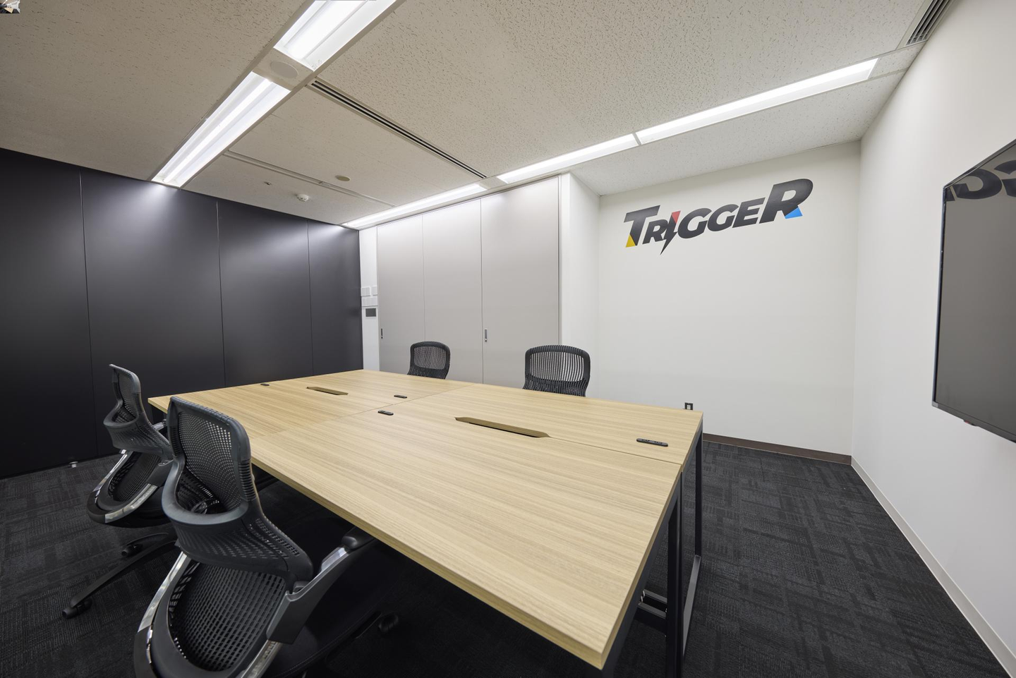 こちらは役員陣専用の会議室。かつてナンバーナインは漫画のセレクトショップ『マンガトリガー』を運営する会社としてスタートしました。そんな創業当時の想いを忘れないように、会議室に「TRIGGER」のデザインロゴが掲げられています。