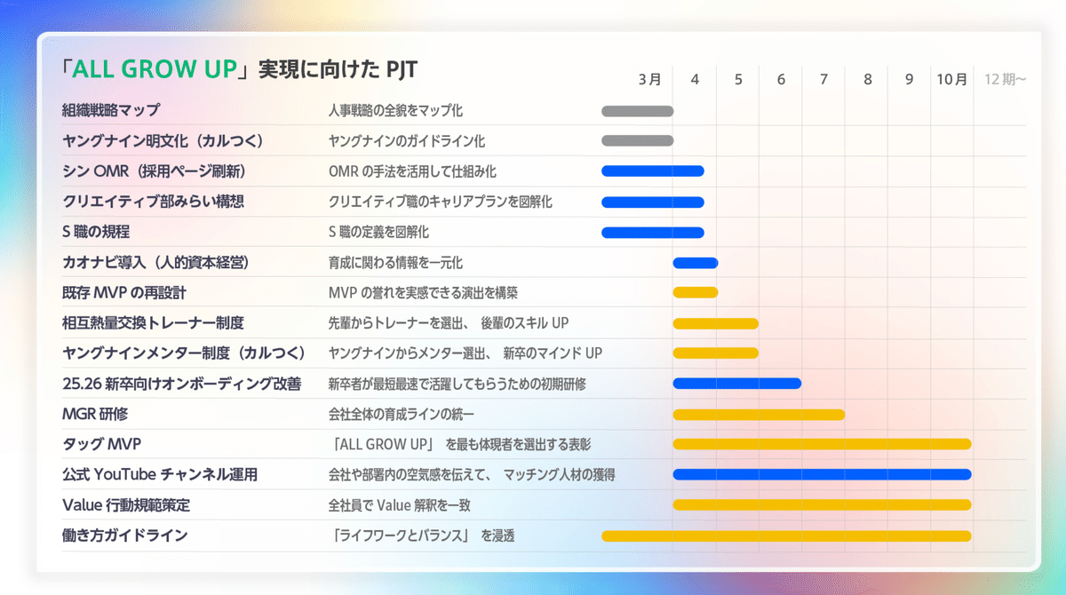 ちなみにこの「ALL GROW UP」の方針は今年の3月に行ったMGR合宿で決めました。そこでの意思決定から2ヶ月。現在はALL GROW UP施策として様々な取り組みを行っております。