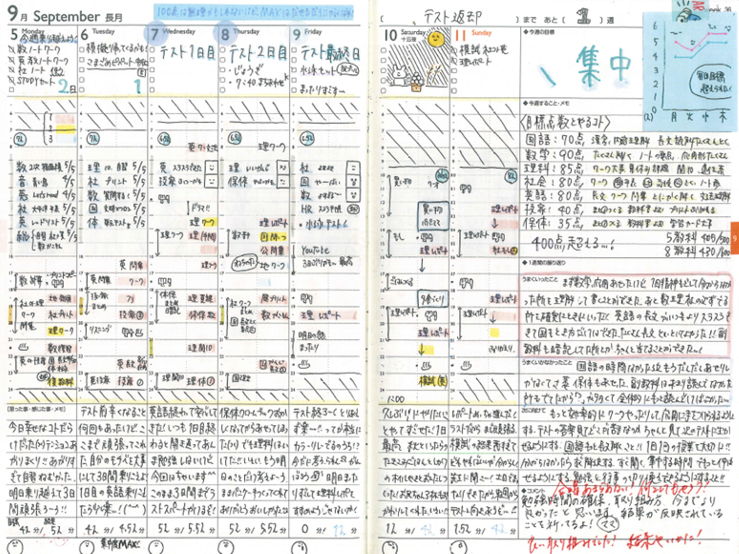 やるべきことや予定をしっかり書けているだけでスゴイ!ですが、わかりやすく予定を色分けしたり、授業ごとの理解度を自分で評価したりと、「自分が使いやすく、成長できるように」考えて使われているのが本当に素晴らしいです!!手帳はよくスケジュール帳とも呼ばれますが、予定を管理するためだけのものではなく、自分と向き合い時間〈とき〉をデザインするツールなのだと改めて思わされます。