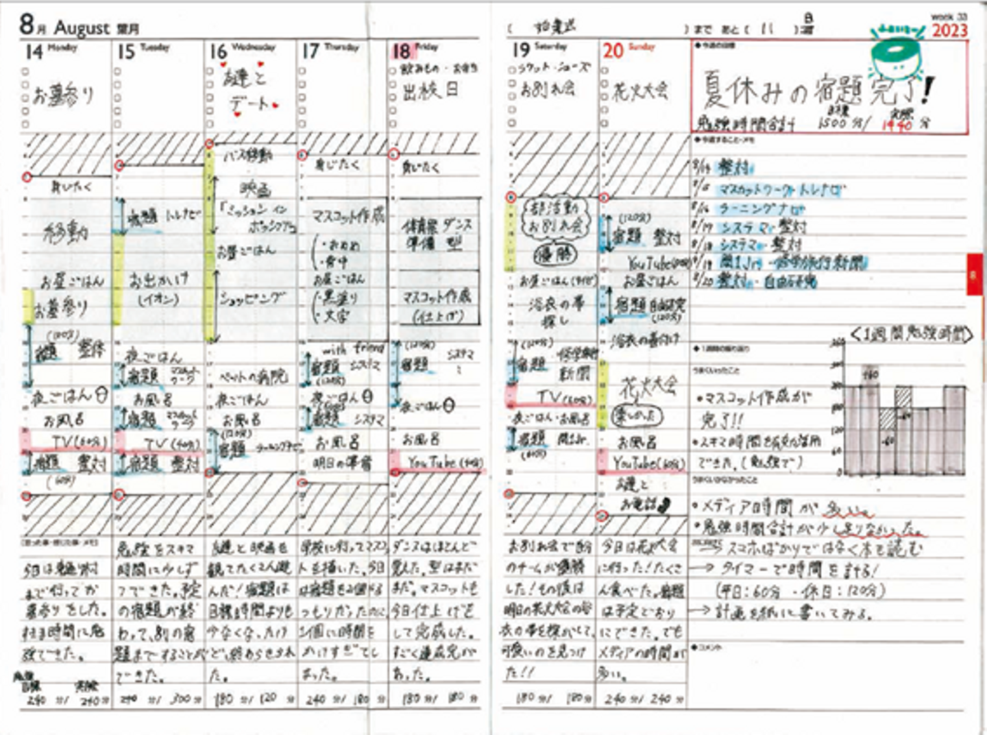 「受験生なので勉強時間をしっかり確保しながらも、帰省や文化祭準備など夏休みを目いっぱい楽しみたい!」という思いから手帳を活用しはじめたそうです。テレビやYouTubeに使った時間も手帳に残し、時間の使い方を振り返っている点も真似したいポイントです。モチベーションを上げるために学習時間をグラフで可視化し、うまく工夫して時間を使えるようになったそう!