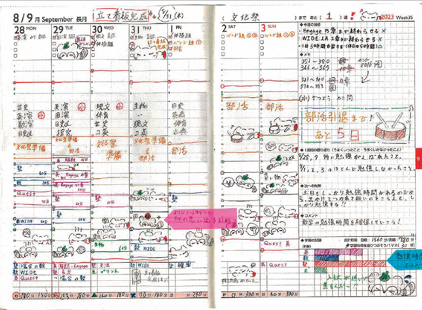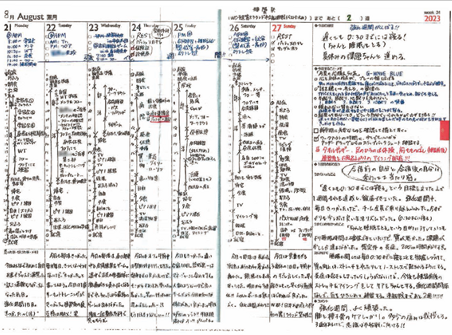 一目見ただけで部活動への情熱が伝わってくるこの手帳!日々使うことで自己肯定感もアップしたとお話いただきました。手帳甲子園には8月の1週間の紙面を応募いただきましたが、プレゼン内では「私の手帳は進化しています!」と、タイムスケジュールがさらに細分化された最新の手帳も見せてくれました。