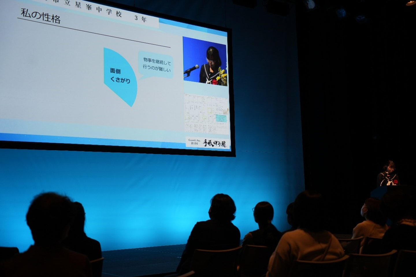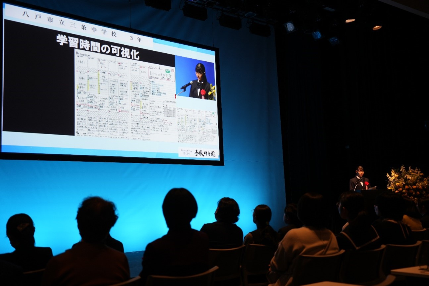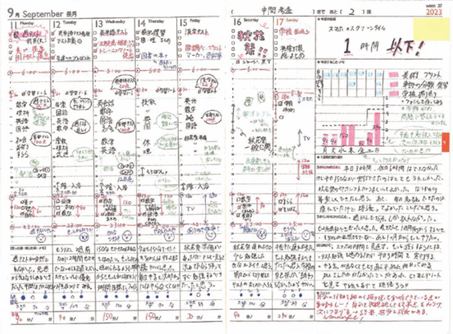 この生徒さんは、手帳に緑のペンで自分の時間の使い方を振り返るコメントを書いて自分自身と対話されています。「手帳はまさになんでも話せる相棒」と表現してくれました!「家に制服のネクタイを忘れてしまうぐらい」緊張されていたそうですが、堂々としたプレゼンでした。