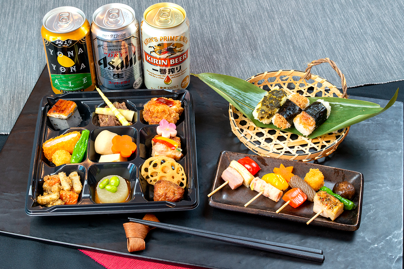 このコラボのために開発したオリジナルの和風ピンチョス4本と、豪華な”江戸の味”アラカルト9品は見て美しい、食べておいしいの一品です。〆にはみやびの寿司職人が作る定番商品、笹の葉一枚で包んだ一口サイズのお寿司「笹一葉寿司」をご自宅でお楽しみ頂けます。
