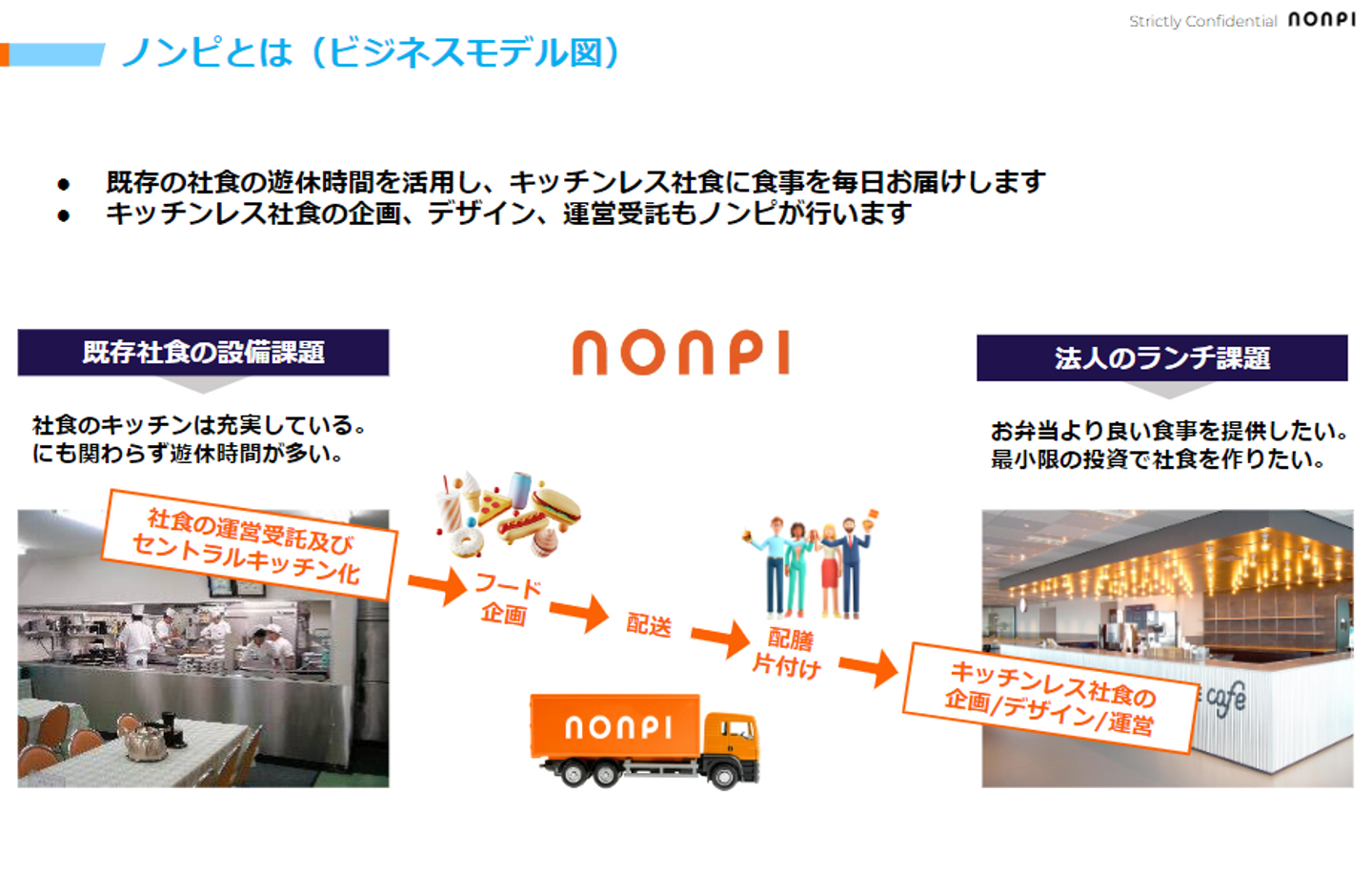 ケータリングでオフィスをコミュニティープレイスに変える「nonpi Chef's LUNCH」、オンライン懇親会向けに料理と飲み物を全国配送し距離の制約を超えたコミュニケーションを実現するフードデリバリー「nonpi foodbox®」をはじめ複数の事業を展開しています。
