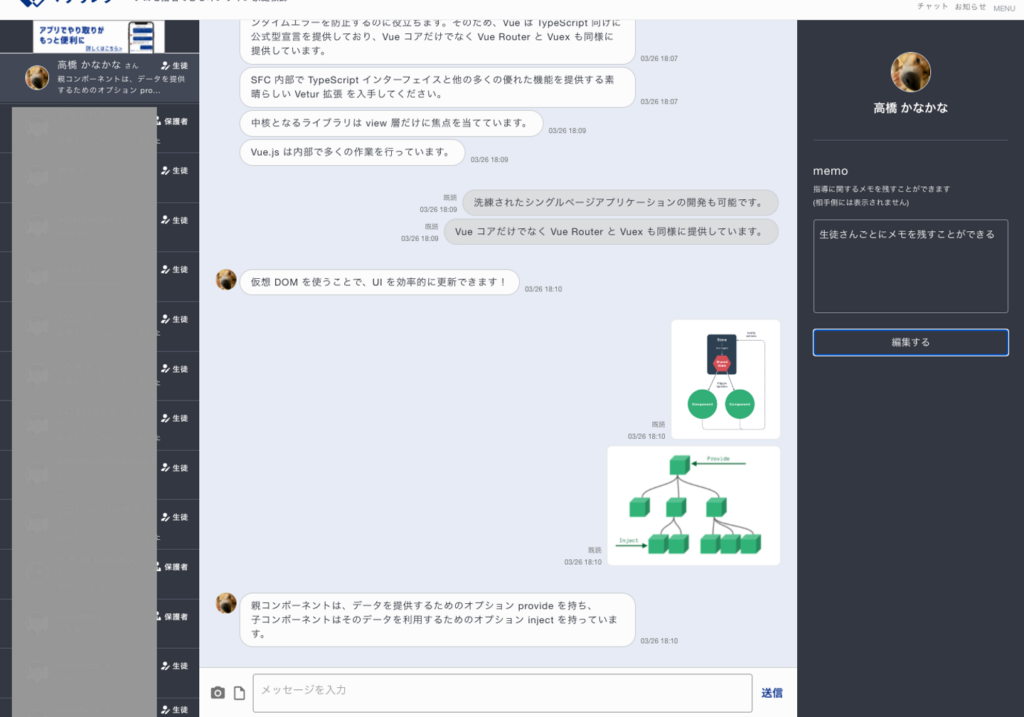 オンライン家庭教師サービスを運営しているマナリンクでは、指導開始後に先生と生徒がチャットでやり取りできる機能をWeb / アプリで提供しています。