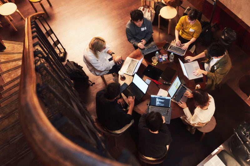 画像注釈: エンジニア以外にも様々なメンバーと議論
