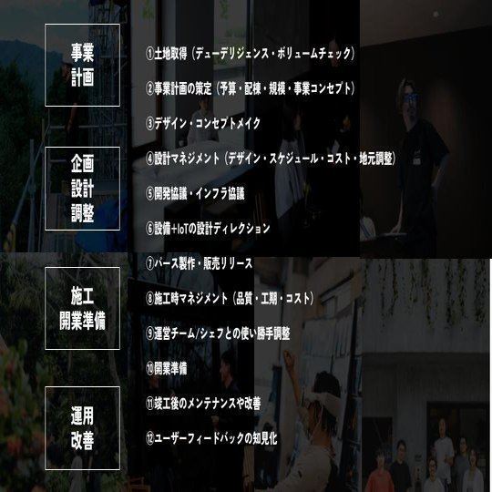 事業開発の仕事の全体像として、まずは絶景となるロケーションを探す。そのうえで、デューデリジェンスや行政協議をしながら、実際の企画を詰めていきます。どういった建築をつくるのか、そのコンセプトや意匠をデザイナーと協議しながら決定。同時に、プロジェクトの事業性を設計し、基本設計をプロジェクトマネージャーに渡すのが一連の流れとなります。