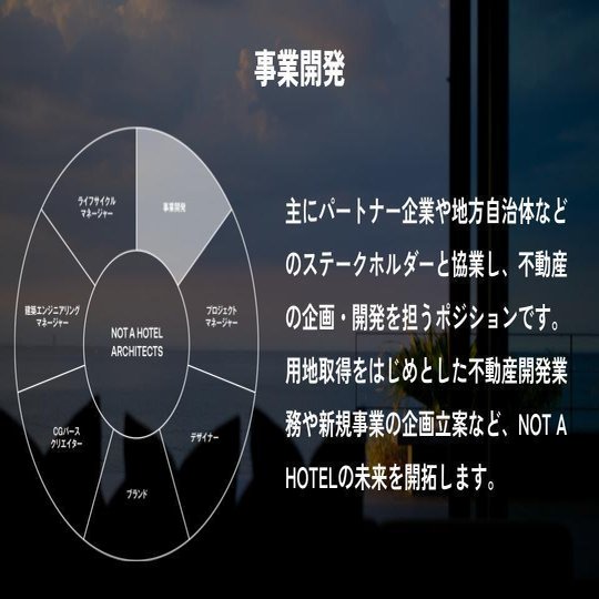 そう聞くと各仕事が単発プロジェクトに思われるかもしれませんが、事業開発はコーポレートやセールスなど、各チームと連携しながら、NOT A HOTELの中期経営計画をともに手がけることも大事な仕事となります。