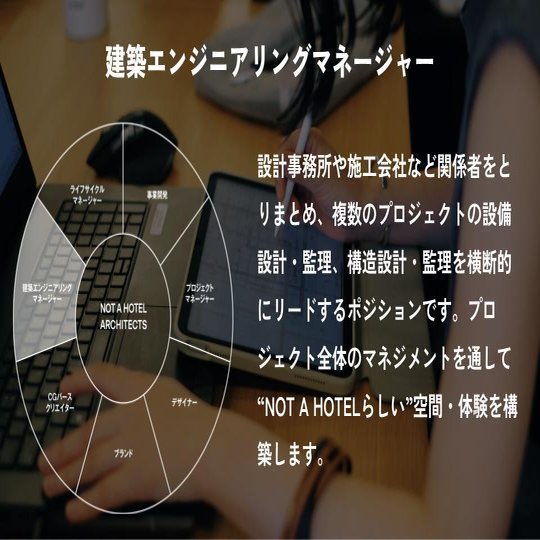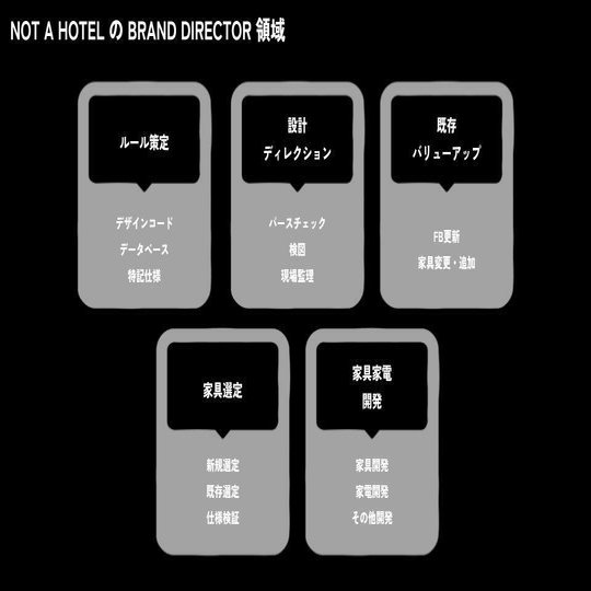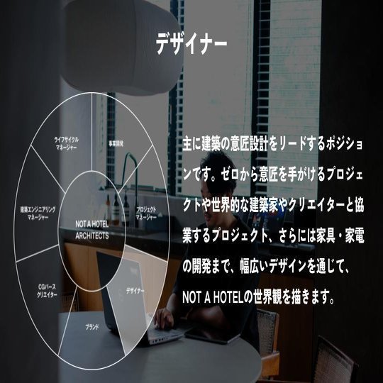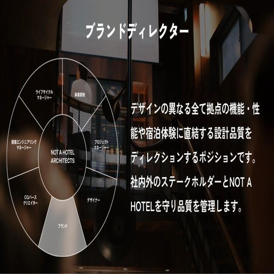 ブランドディレクターは「建築のデザイン、機能、品質の定義・ディテールをこだわり抜き、NOT A HOTELの日常をつくること」が役割です。
