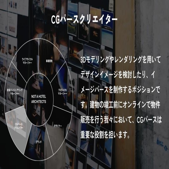 今回のnoteでは「事業開発」「建築PM(プロジェクトマネージャー)」「構造/設備設計」「施設管理」「建築デザイナー(意匠設計)」「CGパースクリエイター」と、ARCHITECTSに関わる職種へ向けたプレゼンの模様をレポート。