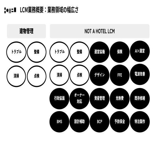 上の図をみても明らかなように、一般的な建物管理業務に比べて、NOT A HOTELのLCMの業務範囲は広いです。