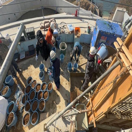 2025年1月から、ついに現地でのラムドアース施工が始まりました。全国から12名の職人が集まってくださり、瀬戸内の土を1g単位で計測しながら水の量を調整し、その場で調合する。目の前のミキサーで一層ずつ土を押し固めていくんです。1日に打てるのは1〜2層。本当に気が遠くなるような作業です。