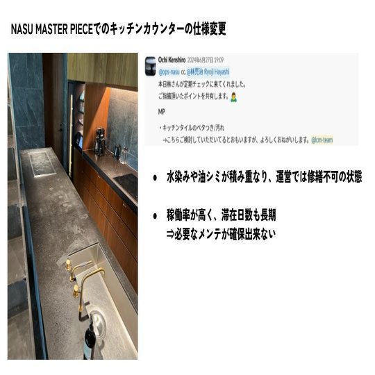 例えば、NOT A HOTEL NASU “MASTERPIECE“での事例。キッチンカウンターに水ジミや油ジミがこびりついていて、拭いても落ちない状態でした。NOT A HOTELは稼働率が高く、90%を超える施設も多い。それに別荘利用のような長期滞在も多いため、十分なメンテナンスのタイミングが取れないこともあります。