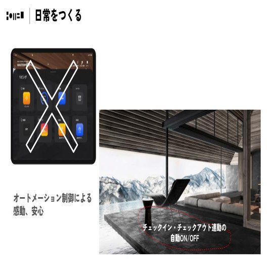 テラスの床暖の操作はiPadではなくオートメーション制御とし、チェックインやチェックアウトに連動して、自動でオンオフされるようにしています。オーナーの手でなんでも操作できるのが良いというわけではなく、どのような体験がスムーズで、かつ感動を生むのかについて、オーナー目線で考えることを最優先にしています。