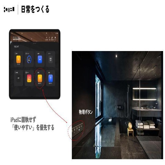 また、iPadで操作するのが基本ですが、例えばお風呂は、裸で脱衣所のiPadを操作するのは不便なので、あえて“物理的なボタン”に回帰する設計も最近は増やしています。