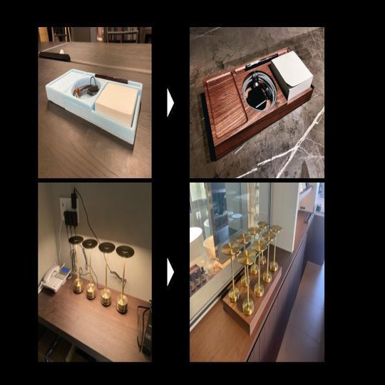 例えば、「NOT A HOTEL FUKUOKA」の拠点では、テーブル上の照明の充電コードが見えないようにするために、特注で充電ボックスをつくりました。コードが絡まったりすると、見栄えも使い勝手も悪くなります。照明をこのボックスの上に置くだけで充電できる仕様にして、完成。これは社内からも「ここまでやるのか」と評価をいただいた取り組みでした。