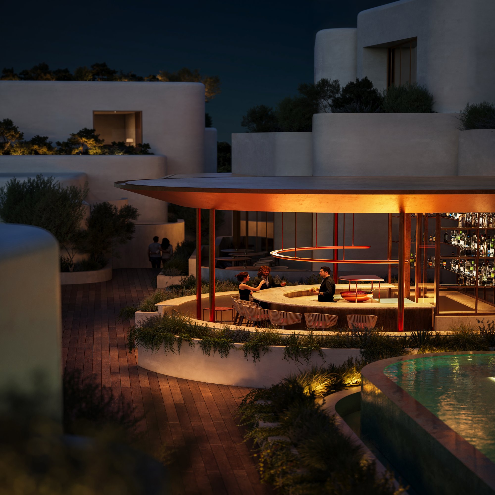 ここは外部には非公開のプライベートな空間なので、静かで落ち着いた雰囲気を出したいと思いました。。ドアバーを真ん中に、その手前に影と植栽、奥にはプールとさらにその奥に続く通路。三層構造にして、奥行きが自然に伝わるようにしました。ナイトシーンにしたことで、映画のワンシーンのような雰囲気も出せたのではないかと思います。