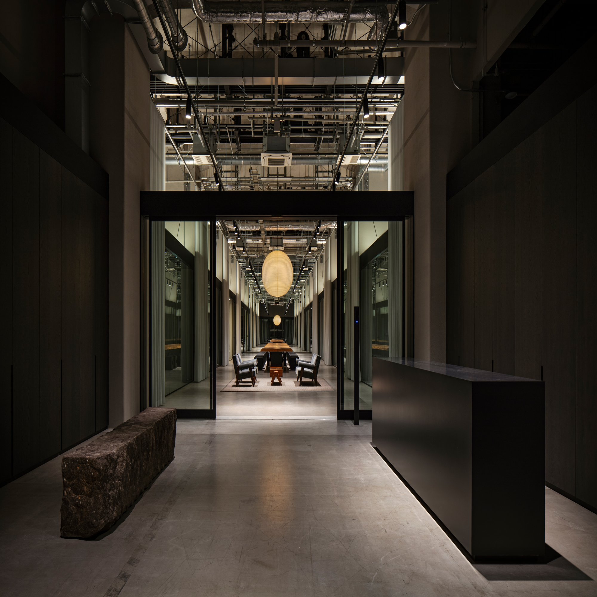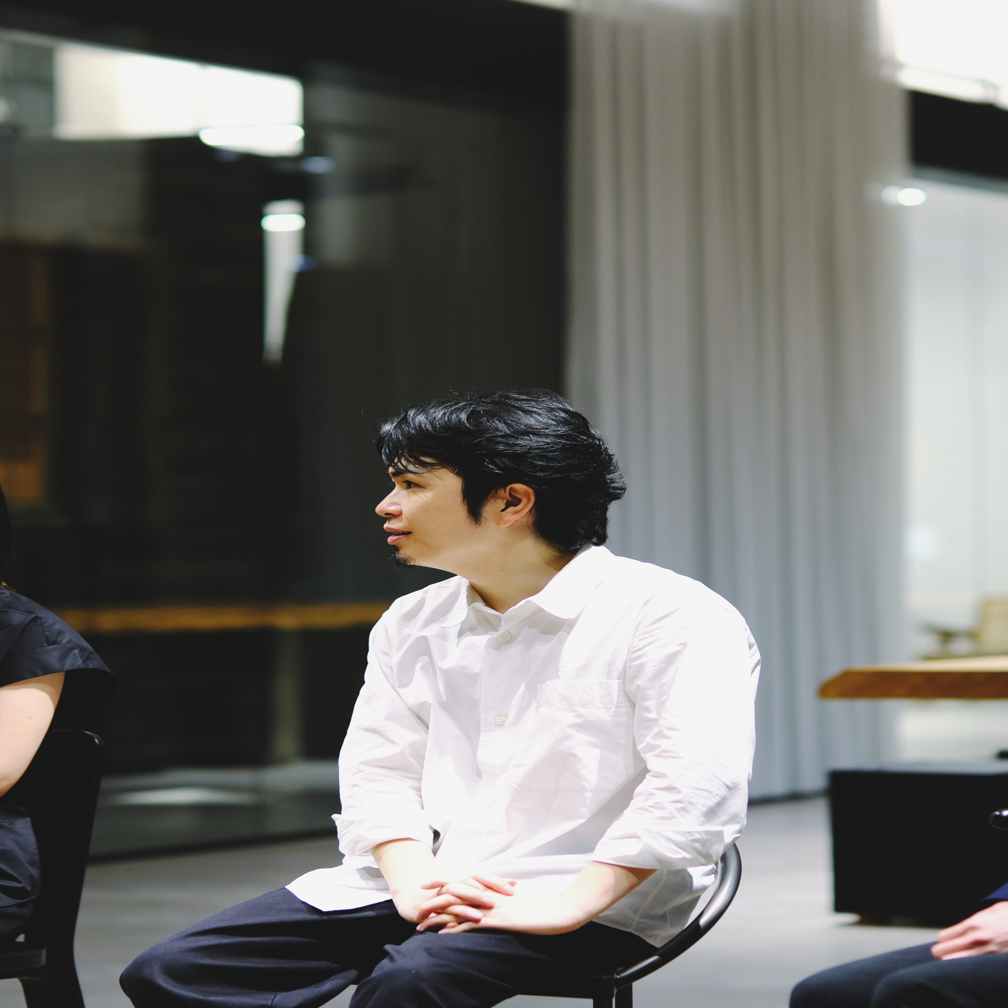 松井:今、志甫さんから黒い梁の話があったので、カーテンについてもぜひ触れたいですね。今回の計画では梁とパーテーションで三枚おろしのように空間を三列に分割し、ゾーニングを分けています。一方でパーテーションは透明なガラスで仕切っているだけなので、視線を遮りたい際にどうプライバシーを確保するのかというのも課題でした。