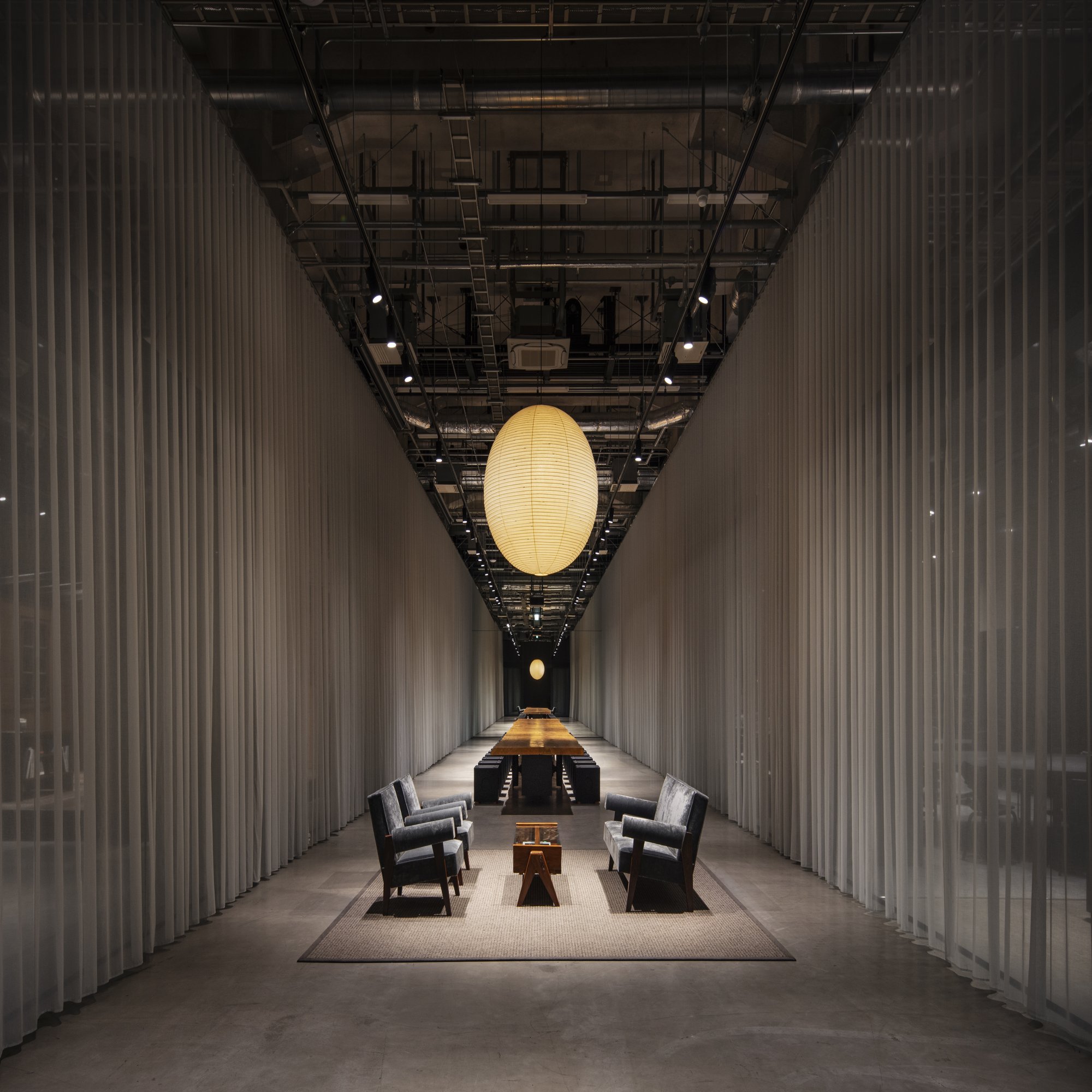 松井:このオフィスは、一般的なオフィスに比べると少し無骨でストイックな印象が強かったので、カーテンのように軽く、柔らかい素材も入ることで、空間全体のバランスが良くなるのではないかと考えたんです。また、カーテンという使い手によって自由に動かせる要素により空間の雰囲気がガラッと変わるのも楽しいですよね。