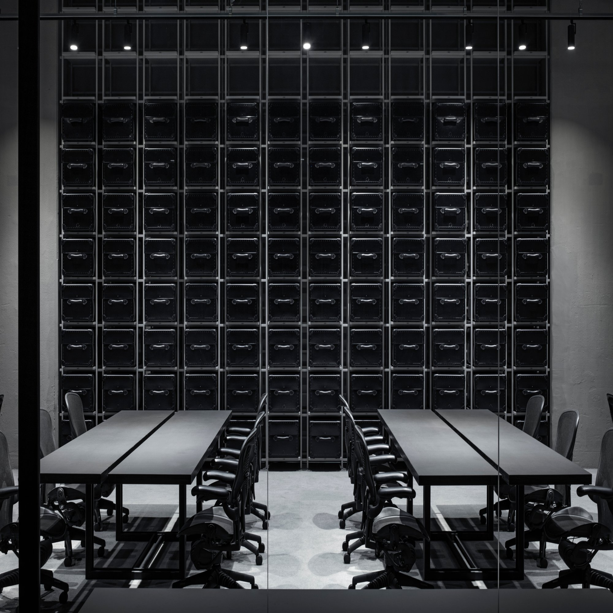 志甫:収納です。このオフィスには収納エリアが少ないというのが計画段階からの課題でした。平面的にスペースを確保するのは難しかったため、空間性を活かして高さ方向に収納スペースを生み出したのがこちらの壁面収納です。NOT A HOTELはいわば旅を楽しむ会社。そこから着想を得て、旅行用スーツケースで有名なグローブトロッターのカスタムモデルを採用しました。