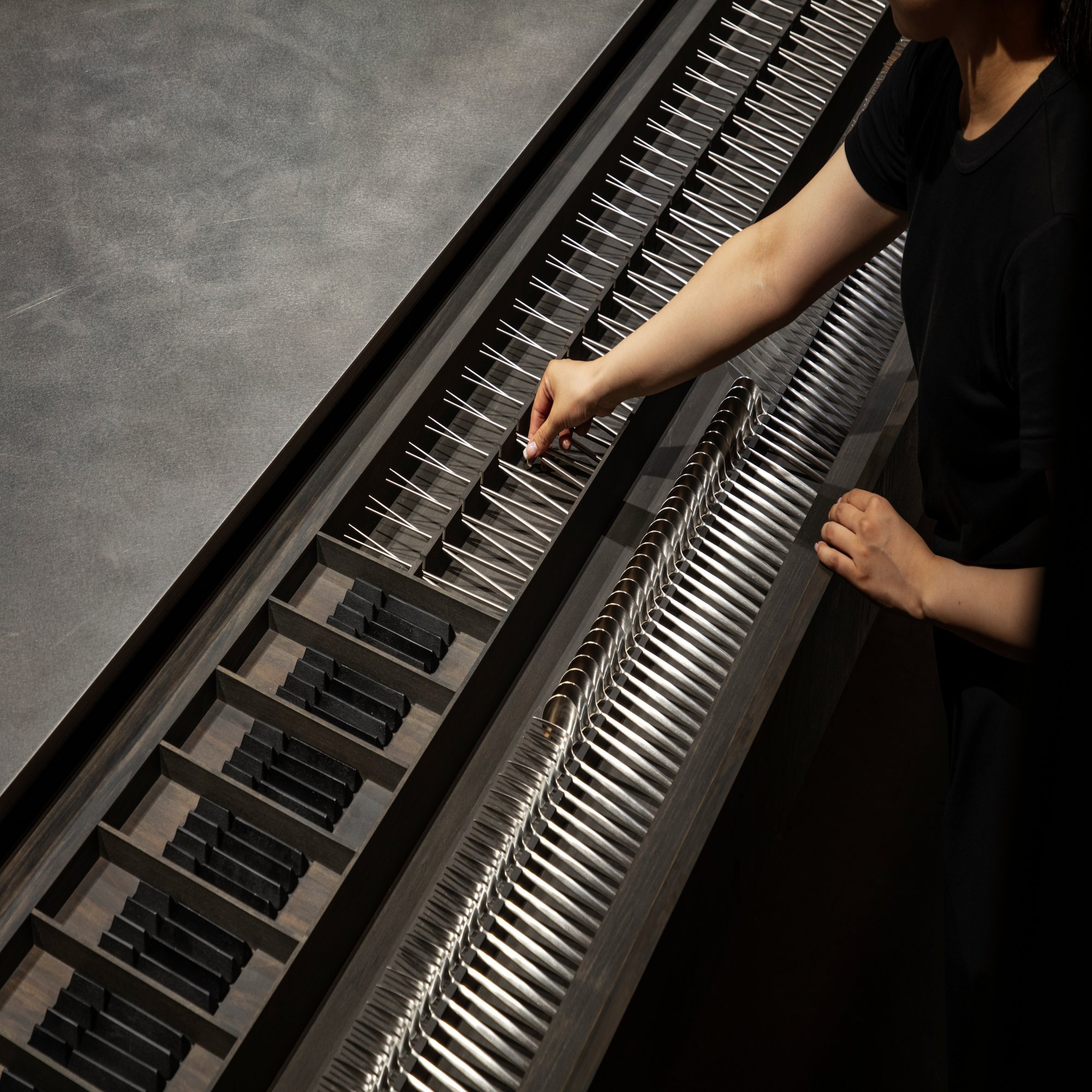 松井:そうですね、NOT A HOTEL仕様のキッチンをベースに、オフィス特別仕様へとアレンジし、ショールームとしても活用できるようなデザインにしています。各拠点で実際に使用されているキッチンツールやカトラリー、グラス、食器などを、手に取ってご確認いただけます。オフィスではパーティでの利用も想定しているため、大人数に対応できるカトラリーや食器類を、3.6m幅の引き出し内に設けたトレイに整然と陳列された姿も圧巻です。