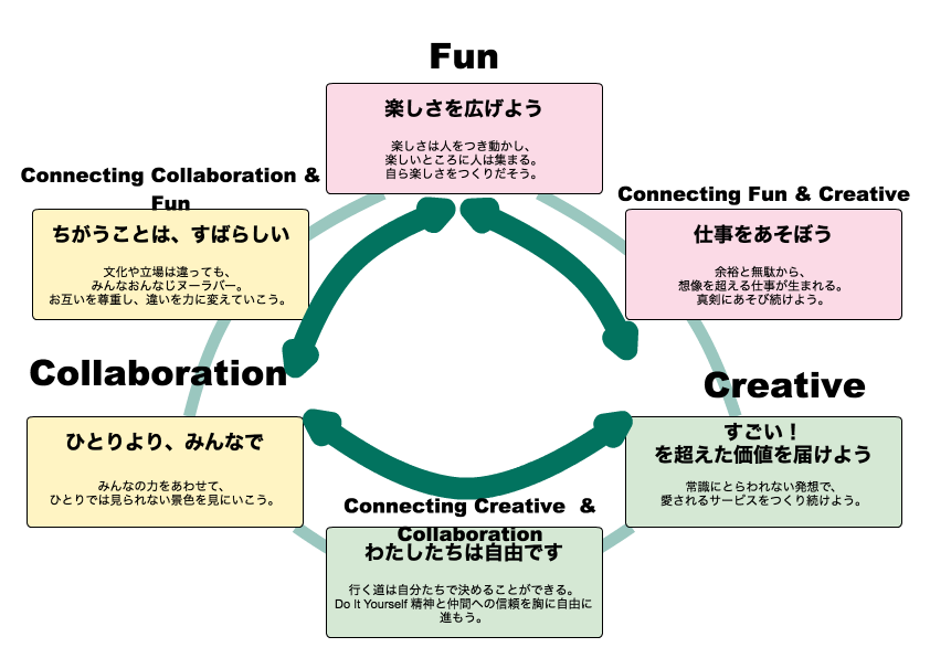 全体像としては、下記の感じで、Fun, Creative, Cllaboration!をそれぞれつなぎあう、