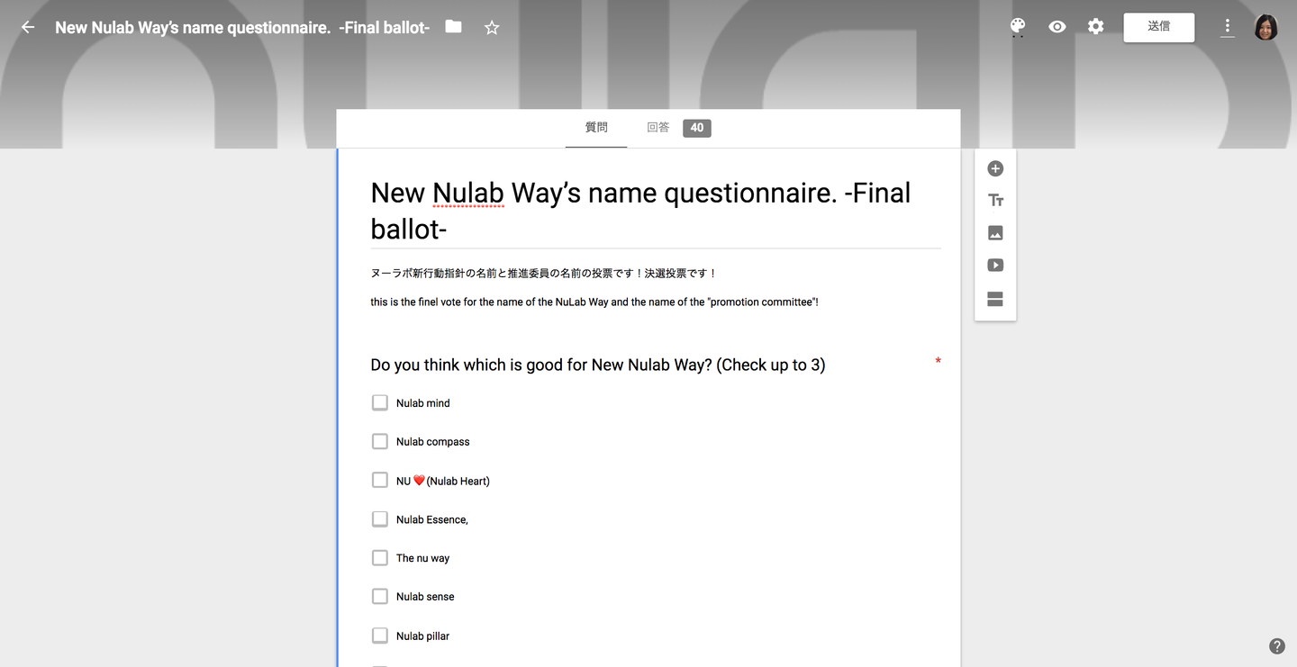 この行動指針をヌーラバーに発表した後、Bridgeメンバーの案、みんなからの案を統合し、社内投票。