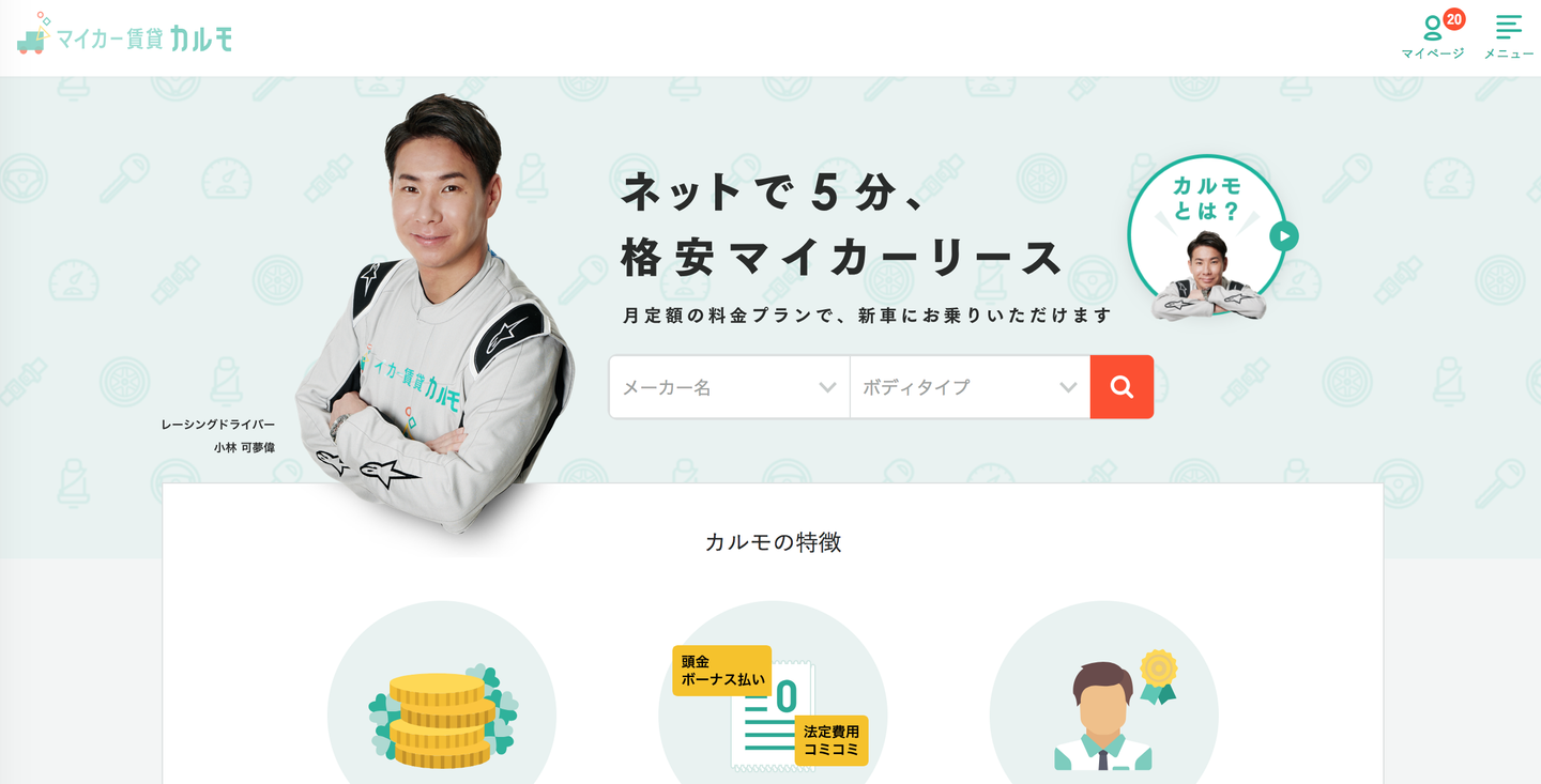 この度、レーシングドライバーの小林可夢偉氏にカルモのイメージキャラクターに就任して頂きました!車大好きな人やレーサーに憧れた人なら皆さんご存知の方ではないでしょうか。