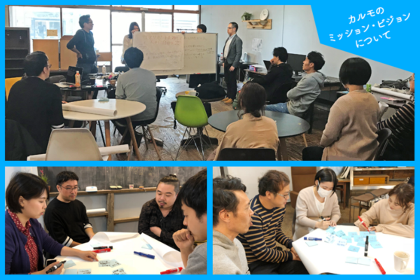 最初に行ったのは「カルモのミッション・ビジョンについて」のディスカッションでした。カルモでは「自動車を無料で保有できる社会を作る」というミッションを掲げています。しかし、ミッションを達成することで「誰がどうなるのか」という利他性を明確な言葉に出来ていないことや、今後の事業展望とミッションに隔たりを感じて始めていました。そこで今回を機に我々が目指す先は何なのかをまず最初に改めて話し合いました。