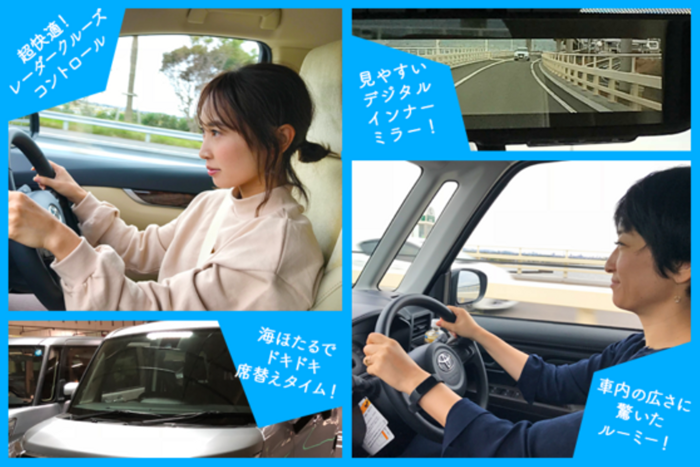 借りたのはヴェルファイア、ルーミー、タントの3台。普段からマイカーに乗っているメンバーも、乗り心地の違いや最新装備を真剣に確認し、色々と議論しながらのドライブです。特に話題になったのはヴェルファイアのデジタルインナーミラーとレーダークルーズコントロール。カタログの業務知識としては知っていても実際に乗って使ってみて、その技術の進歩と得られる先進的な体験にみんなが感動です。