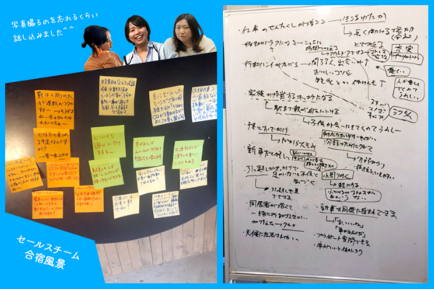 などのテーマについて全員でディスカッションをし、時には実際のお客様との会話を思い出しながら、みんなで意見を出し合い、私たちなりの答えを得ることができました。