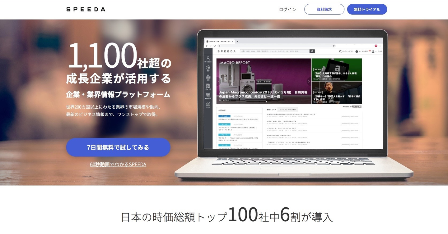 はい。BtoB向けの製品でなじみが薄いかもしれませんが、SPEEDAは今年でリリース10周年を迎えます。コンサルティングファーム、金融機関、事業会社の経営企画部門など1,100社以上にご利用いただいていて、売上高の約4割を支える事業です。