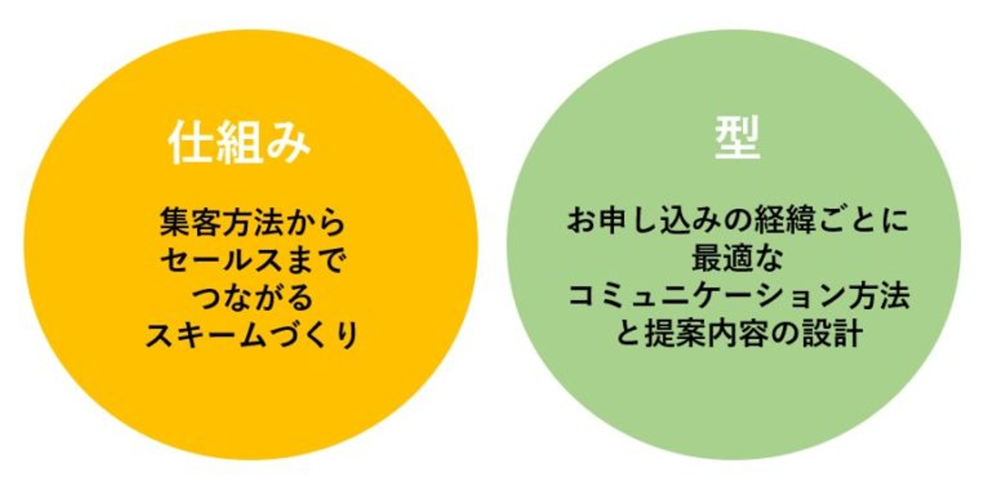 私たちのビジネスモデルは、「仕組み」と「型」で拡大していく必要があります。「仕組み」は集客方法からセールスまでつながるスキームのことで、「型」はご契約いただくための営業手法です。