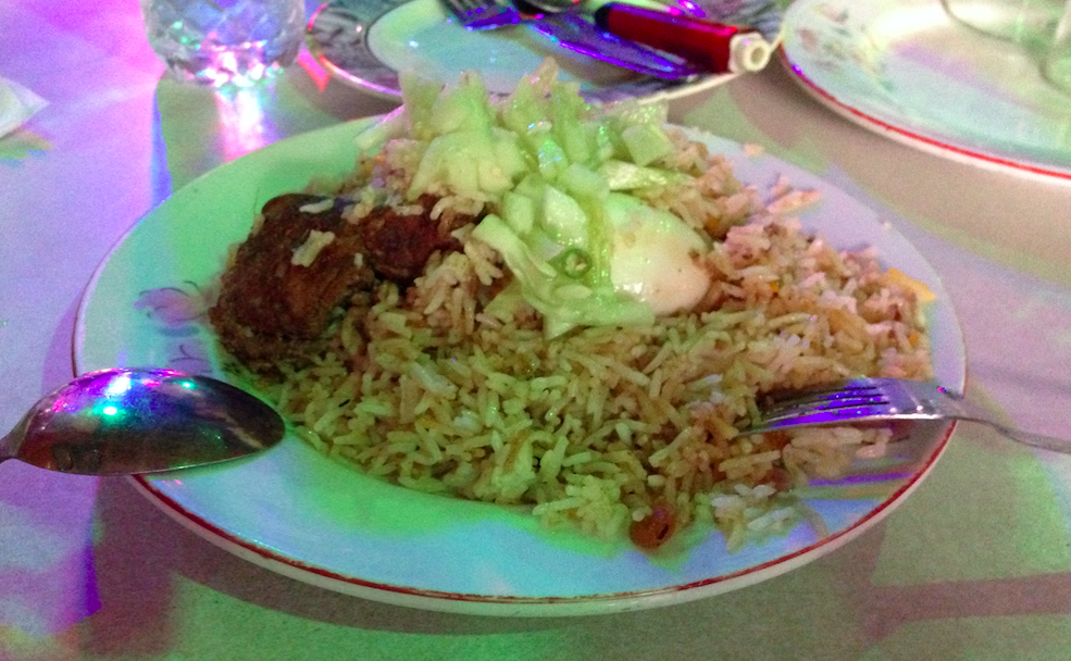 この日食べたのはビリヤニ!うちにある鍋のでかいバージョンが店の前にボンボンと3つ並べられていて、それぞれチキン、ビーフ、マトンのビリヤニを炊いていました。