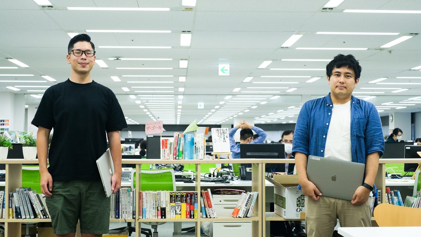(右)大舘雄太さん。2018年4月に新卒入社。現在は、サーバーサイドのエンジニアとして、マイクロサービスの開発技法を用い、システム基盤の俊敏性を高めるプロジェクトに取り組む。休みの日は、サイクリングや風景写真を撮りにいくことが多い。