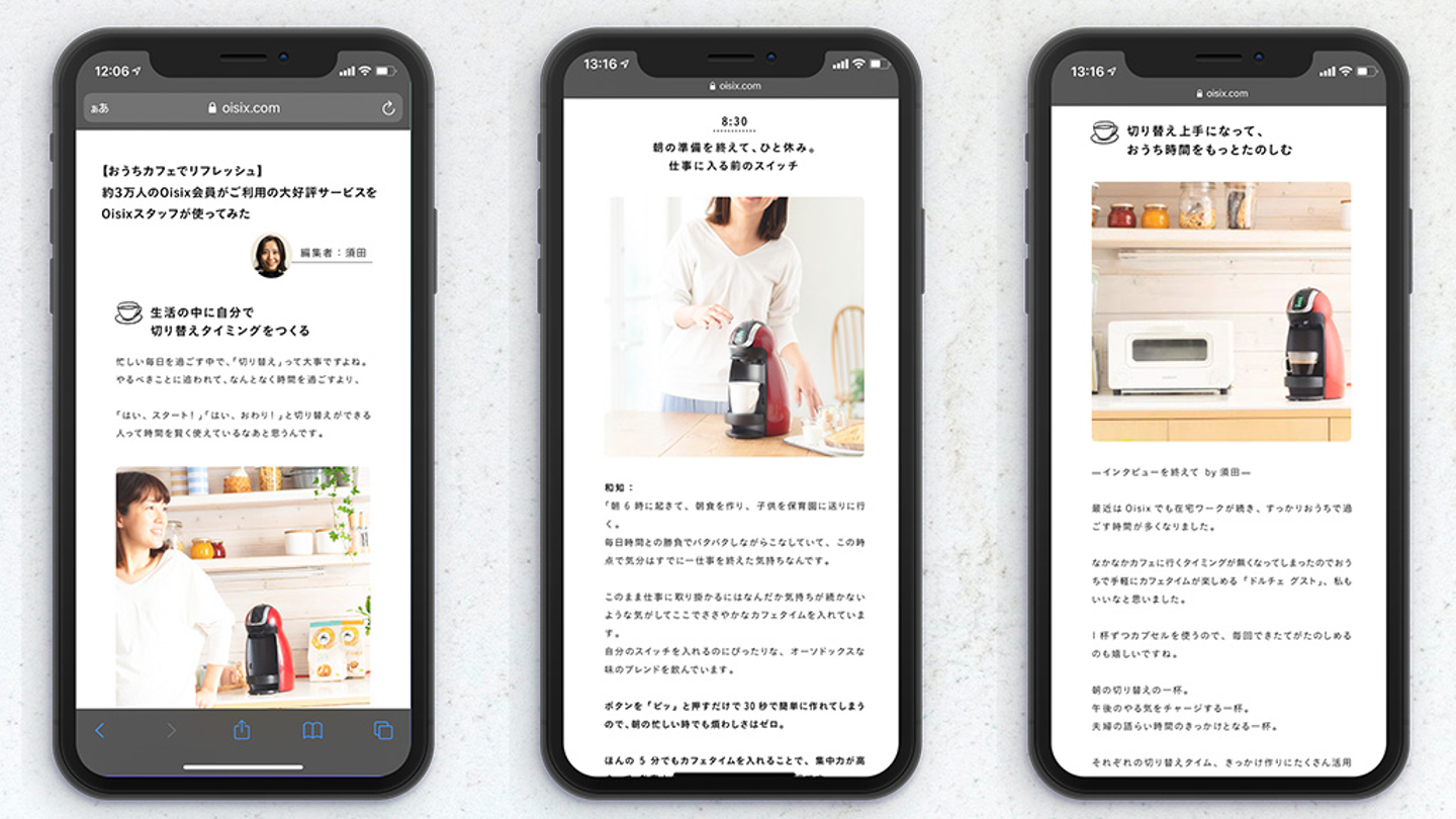 先日、私が担当している『ネスカフェ ドルチェ グスト』についても記事を作成させてもらいました。コーヒー好きであるOisixのママスタッフに実際にサービスを体験してもらい、暮らしがどう変わったのかを聞いて、記事にまとめています。