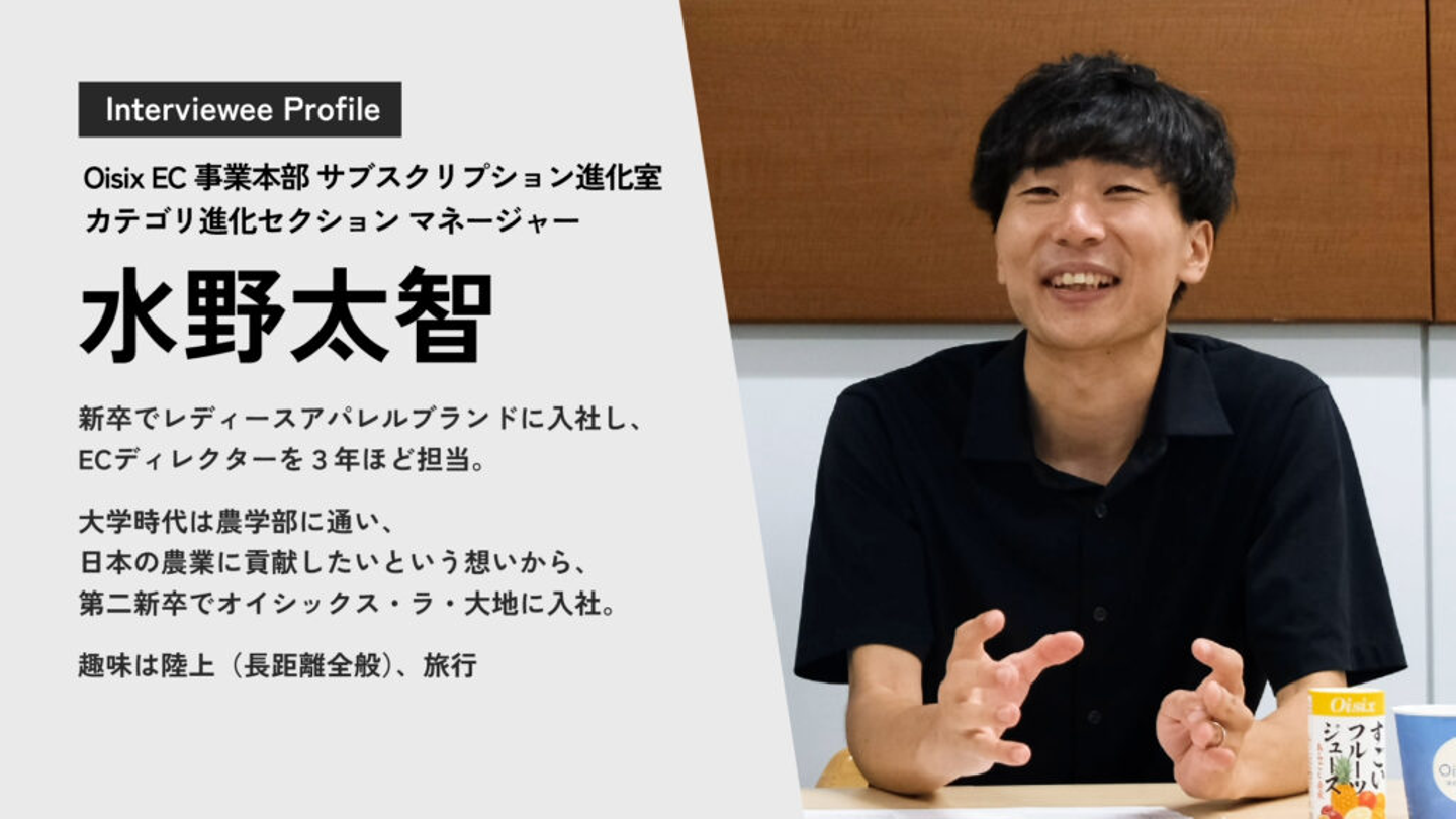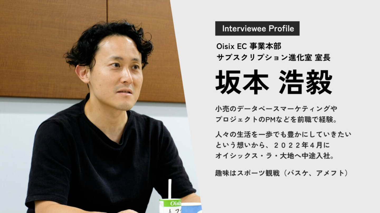 「これからの食卓、これからの畑」を理念に、食にまつわる様々な課題の解決を目指すオイシックス・ラ・大地。今回は、Oisixの売り場づくりを担当する、Oisix EC事業部 サブスクリプション進化室の坂本浩毅さんと水野太智さんを紹介します。