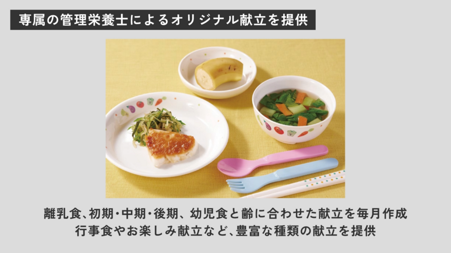 そうした背景から、離乳食の初期・中期・後期から幼児食に加えて、アレルギーに対応した献立を毎月作成し、無償で提供しています。また、季節に応じた行事食やお楽しみ献立なども用意しています。このように、給食現場の業務負荷を軽減しながら、子どもたちの食を豊かにする手伝いをさせてもらっています。