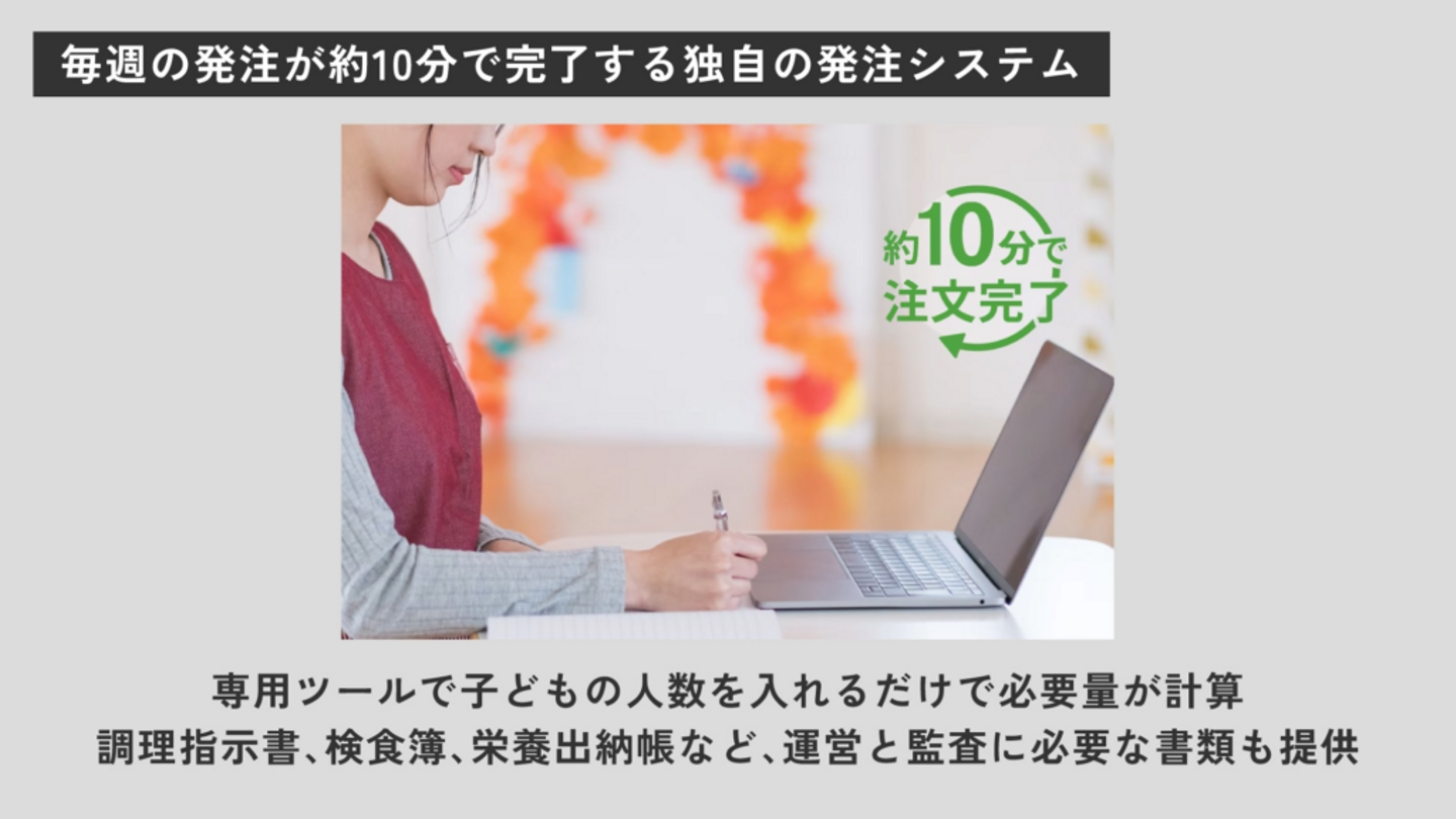 また、保育施設の調理現場を見ていくと、毎週の食材の発注にも、かなりの時間が取られていることがわかってきました。