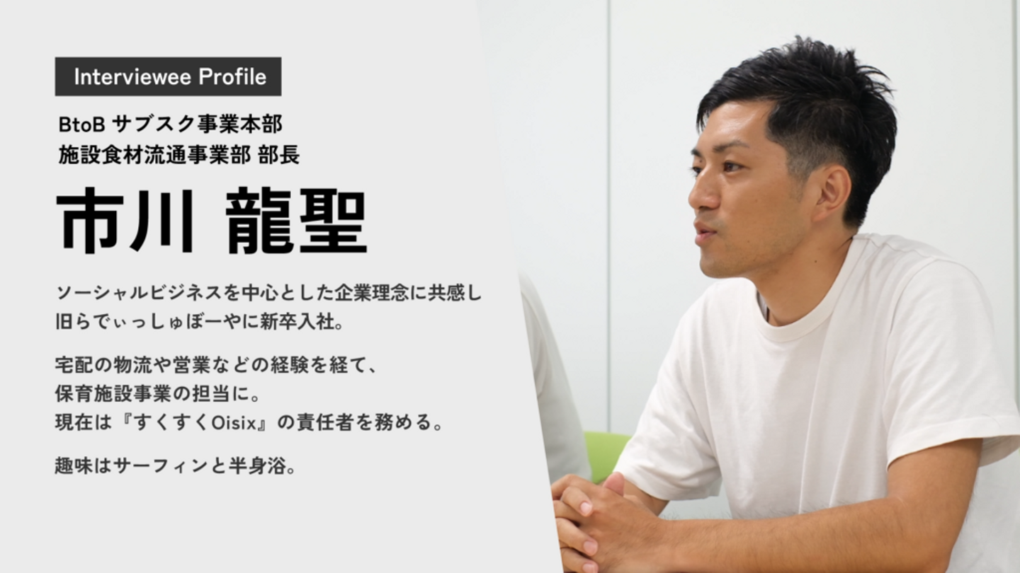 「これからの食卓、これからの畑」を理念に、食にまつわる様々な課題の解決を目指すオイシックス・ラ・大地。今回は、保育施設向け給食サービス『すくすくOisix』を運営する、施設食材流通事業部の市川龍聖さんと髙﨑卓郎さんを紹介します。