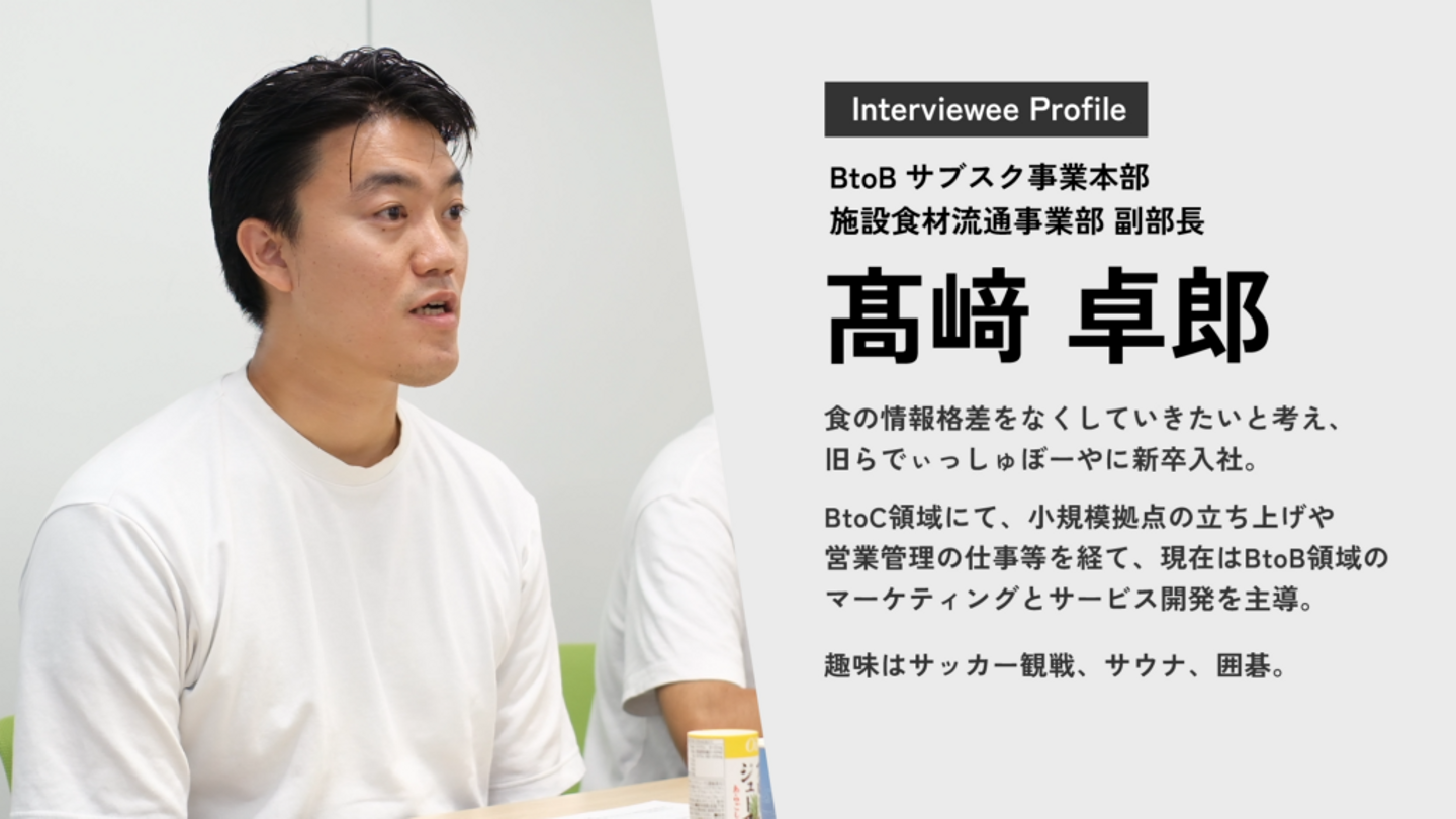 施設食材流通事業部の副部長をつとめている髙﨑です。マーケティングと事業のDX推進の責任者をつとめています。