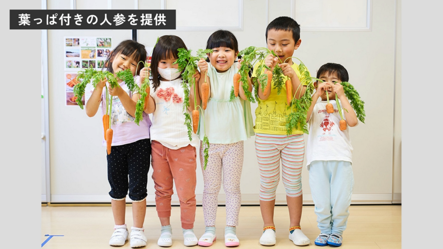 例えば、産地の農家さんが食育の一環として、葉っぱつきの人参や、畑の姿が想像できるような食材を保育施設用に収穫して送ってくださいます。また、農家さんが野菜について教えてくれる紙芝居も提供しています。